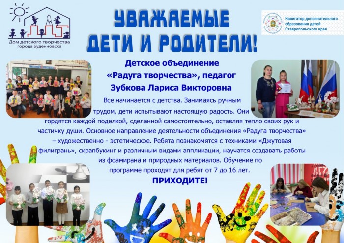 Основное направление деятельности объединения «Радуга творчества» – художественно - эстетическое. Обучение по программе для ребят от 7 до 16 лет.