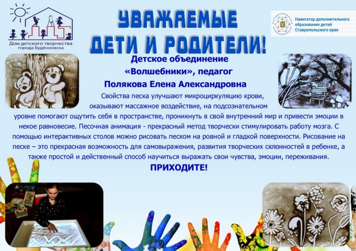 Детское объединение «Волшебники» создано на базе Дома детского творчества в 2017 году педагогом дополнительного образования Лазаревой Екатериной Александровной. Ребята занимаются по программе «Волшебный песок» (песочная анимация), а также по программе «Семицветик» - по развитию мелкой моторики. Занятия проводятся индивидуально, а также в подгруппах. Принимаются дети от 6 до 14 лет.